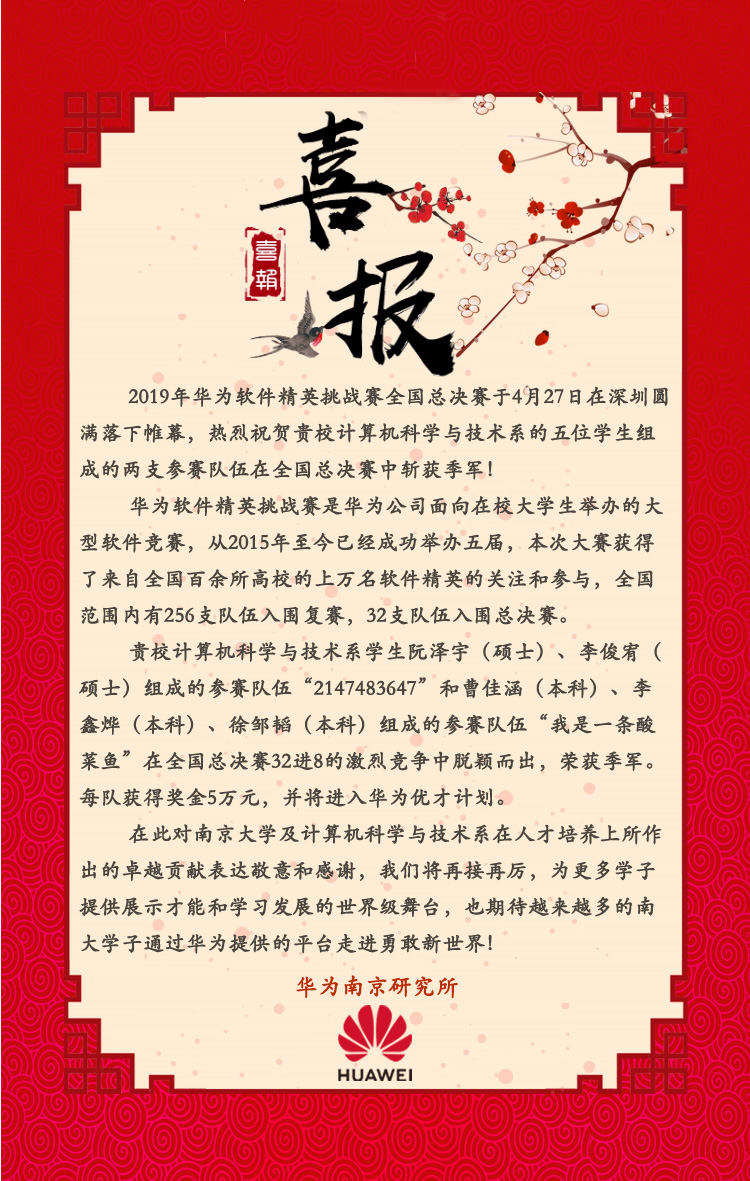 本系员工阮泽宇(硕士)、李俊宥(硕士)组成的参赛队伍“2147483647”和曹佳涵(本科)李鑫烨(本科)、徐邹韬(本科)组成的参赛队伍“我是一条酸菜鱼”在全国总决赛32进8的激烈竞争中脱颖而出,荣获季军。每队获得奖金5万元,并将进入华为优才计划。