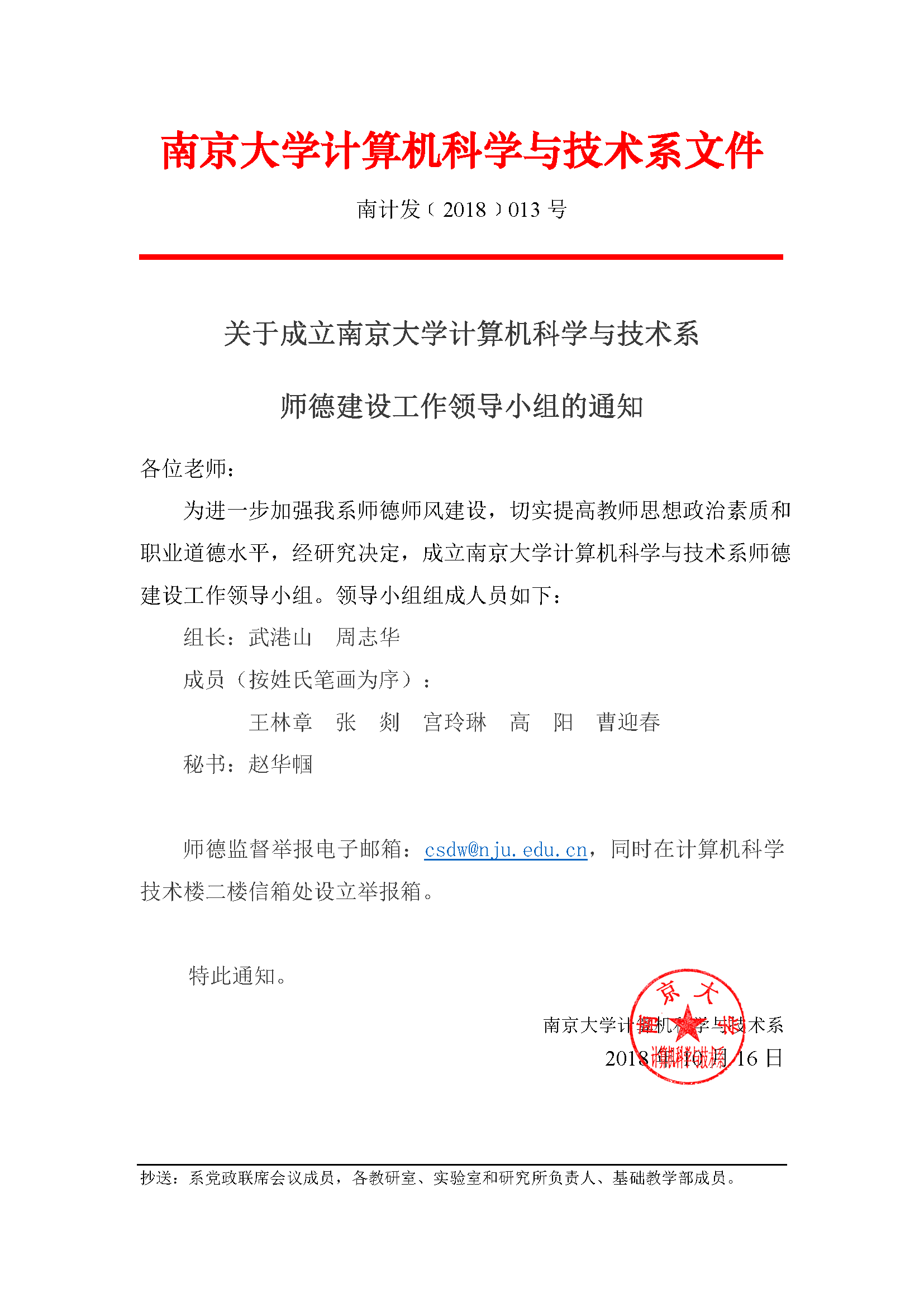 关于成立 WILLIAMHILL在线体育投注计算机科学与技术系 师德建设工作领导小组的通知