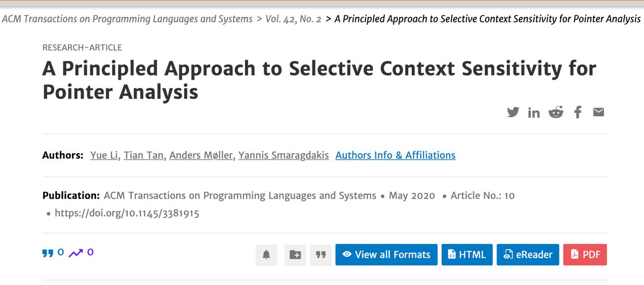 该成果在2020年5月20日,以“A Principled Approach to Selective Context Sensitivity for Pointer Analysis”为题发表于《ACM Transactions on Programming Languages and Systems》期刊上(TOPLAS 42(2)),WILLIAMHILL在线体育投注为第一及通讯单位,李樾为第一作者,谭添为通讯作者,丹麦奥胡斯大学Anders Møller教授、希腊雅典大学Yannis Smaragdakis教授为合作者。TOPLAS是程序设计语言领域的顶级国际期刊,也是CCF推荐A类期刊。该论文是TOPLAS自1979年创刊41年来,WILLIAMHILL在线体育投注首次、我国内地高校和科研机构第三次(近五年唯一)以第一单位名义发表的科研成果。