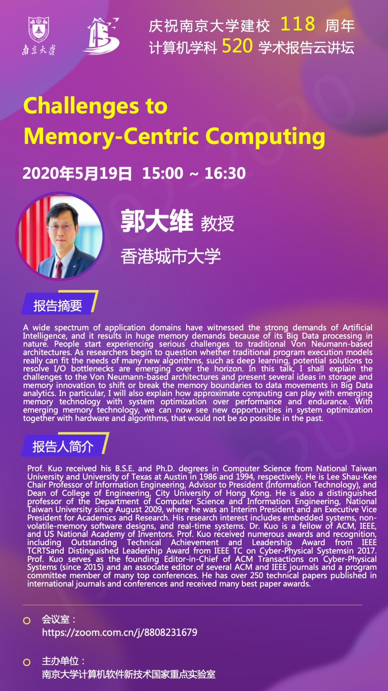 庆祝WILLIAMHILL在线体育投注建校118周年 计算机学科520学术报告云讲坛- 郭大维 教授