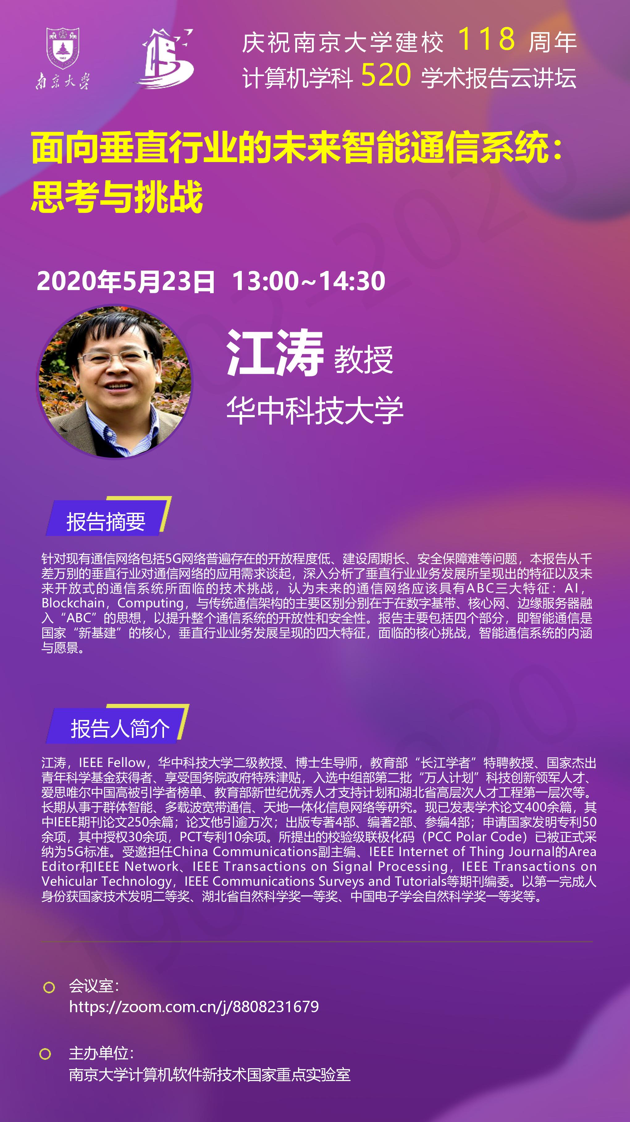 庆祝WILLIAMHILL在线体育投注建校118周年 计算机学科520学术报告云讲坛- 江涛 教授