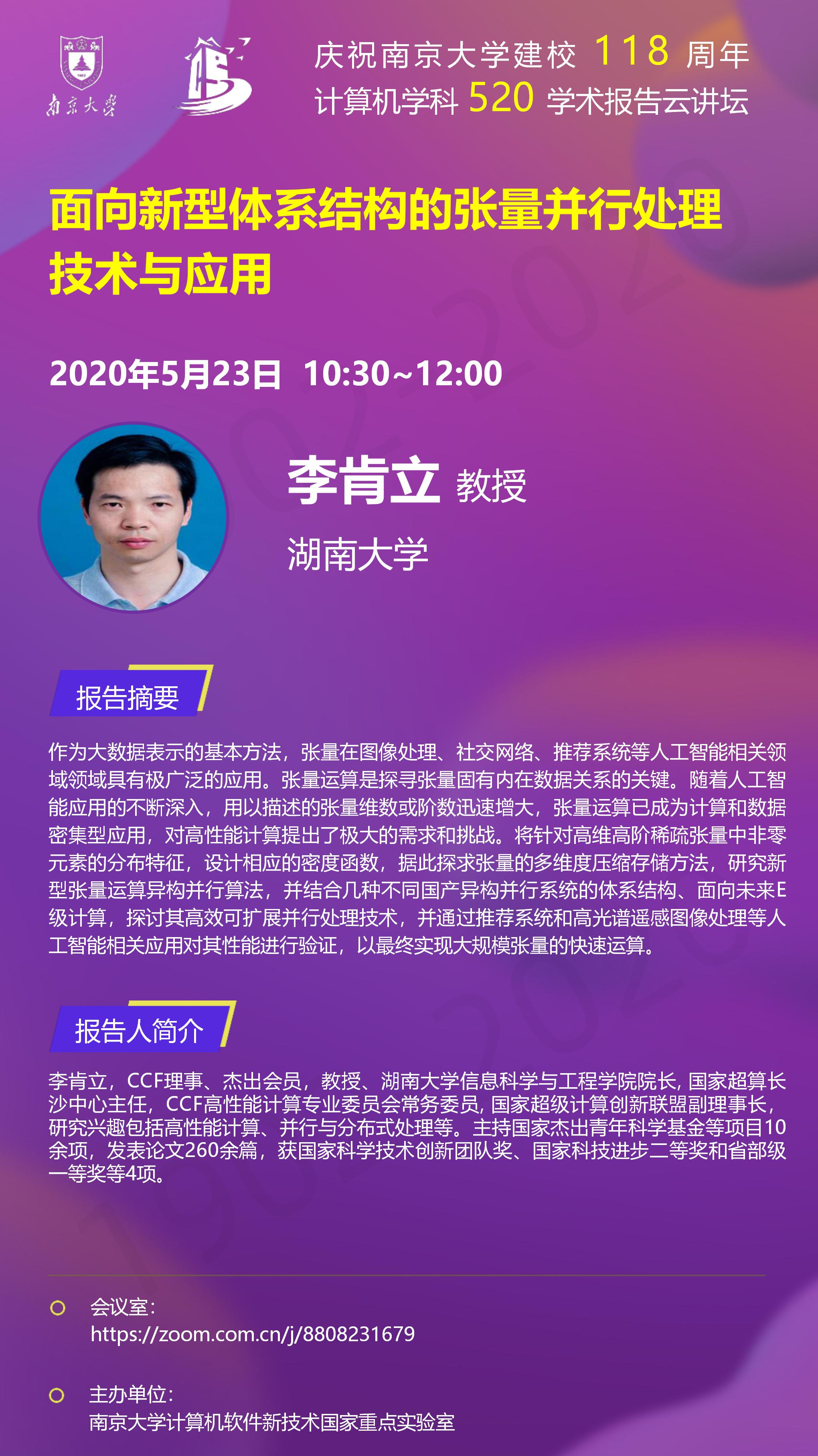 庆祝WILLIAMHILL在线体育投注建校118周年 计算机学科520学术报告云讲坛- 李肯立 教授