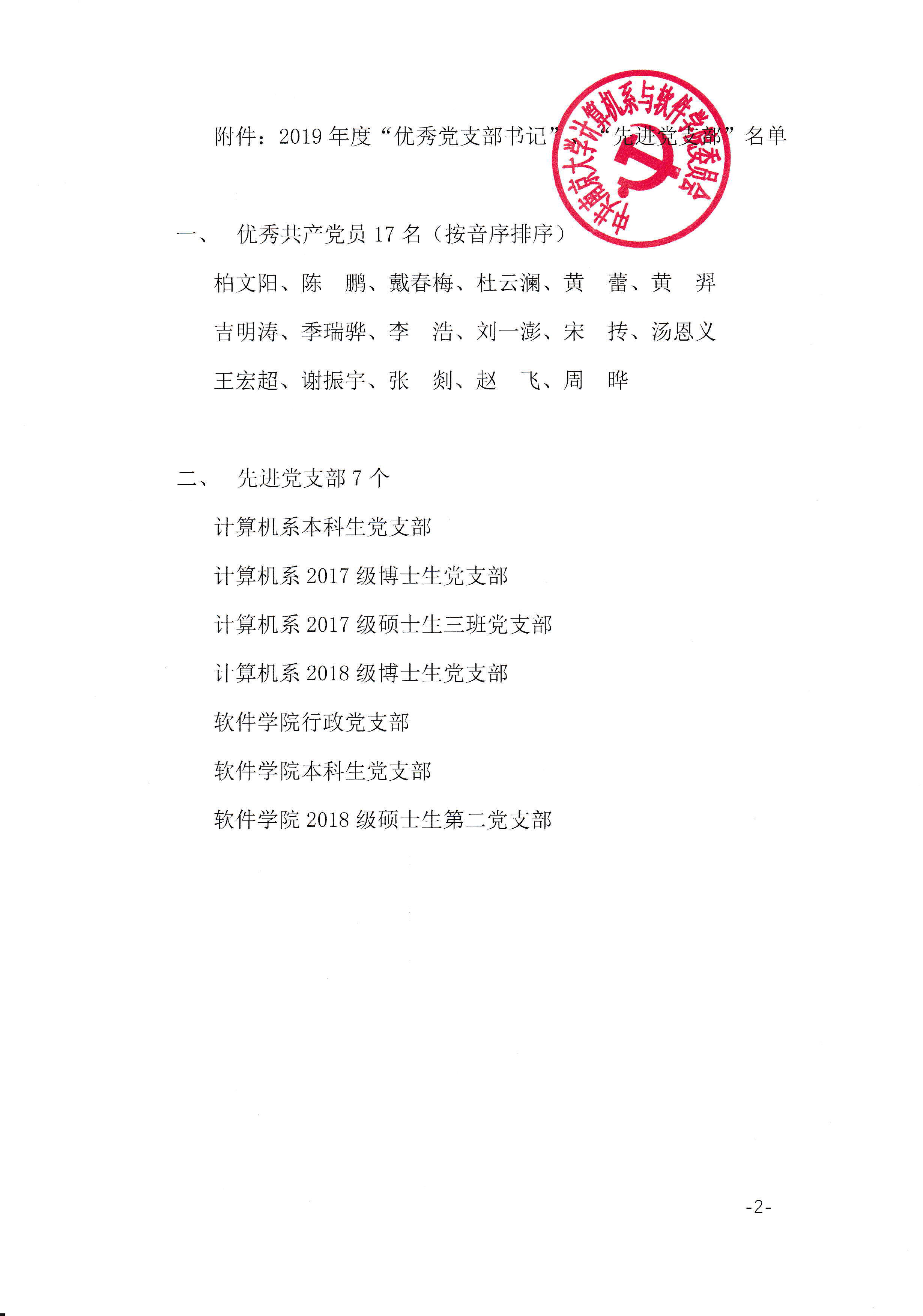 关于表彰2019年度优秀党支部书记、先进党支部的决定