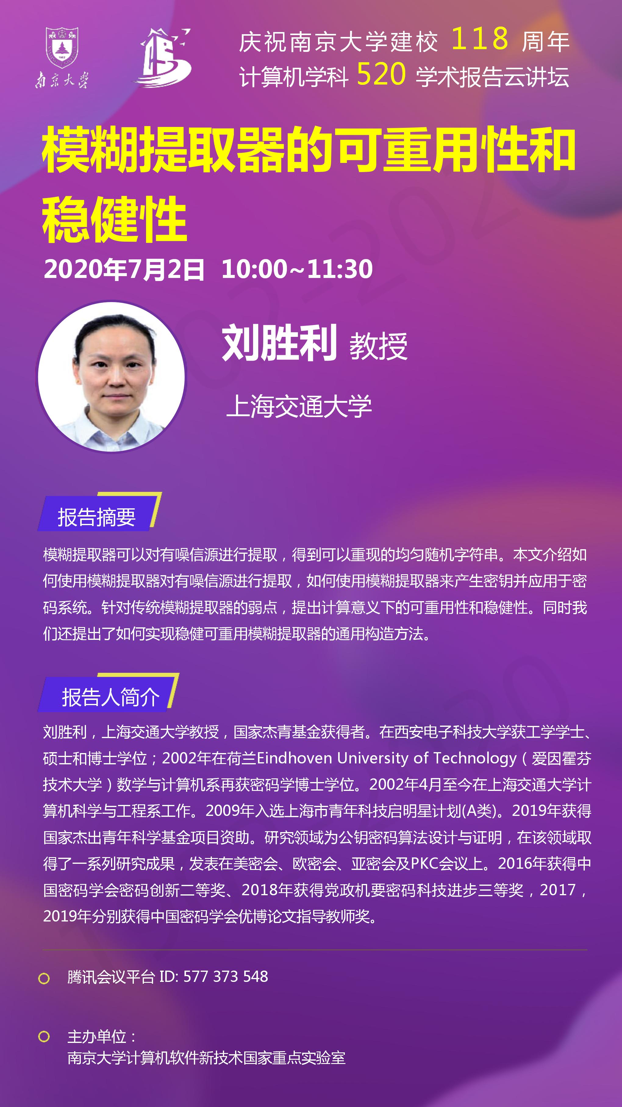 庆祝WILLIAMHILL在线体育投注建校118周年 计算机学科520学术报告云讲坛- 刘胜利 教授