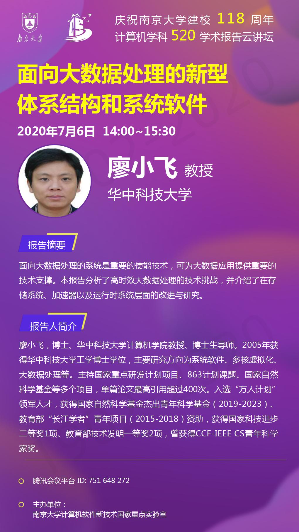 庆祝WILLIAMHILL在线体育投注建校118周年 计算机学科520学术报告云讲坛- 廖小飞 教授