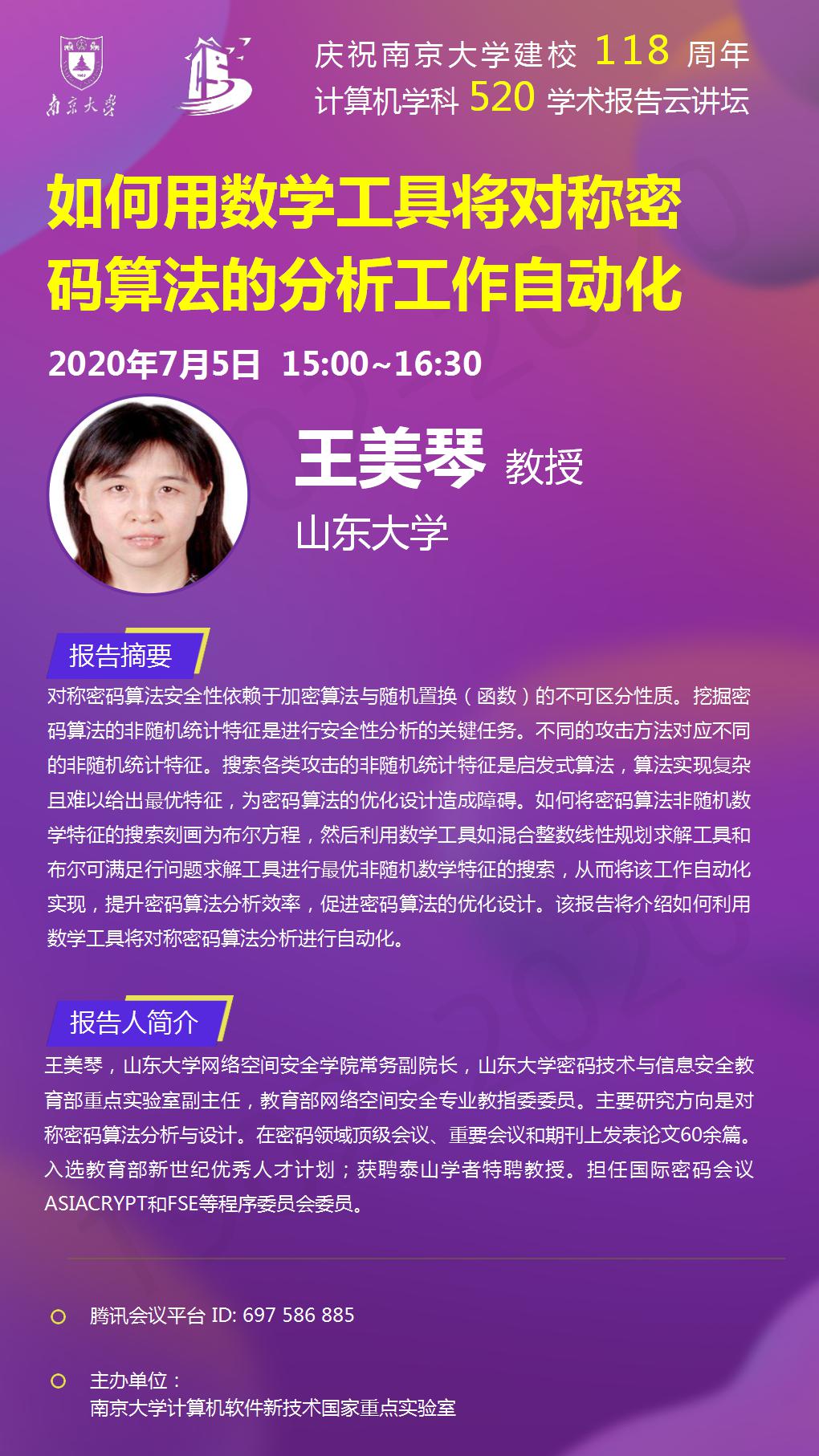 庆祝WILLIAMHILL在线体育投注建校118周年 计算机学科520学术报告云讲坛- 王美琴 教授