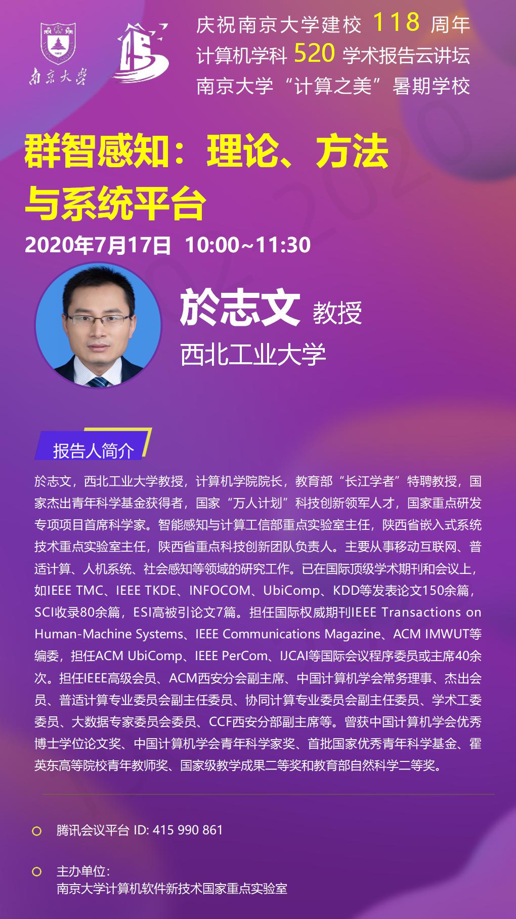 庆祝WILLIAMHILL在线体育投注建校118周年 计算机学科520学术报告云讲坛- 於志文 教授