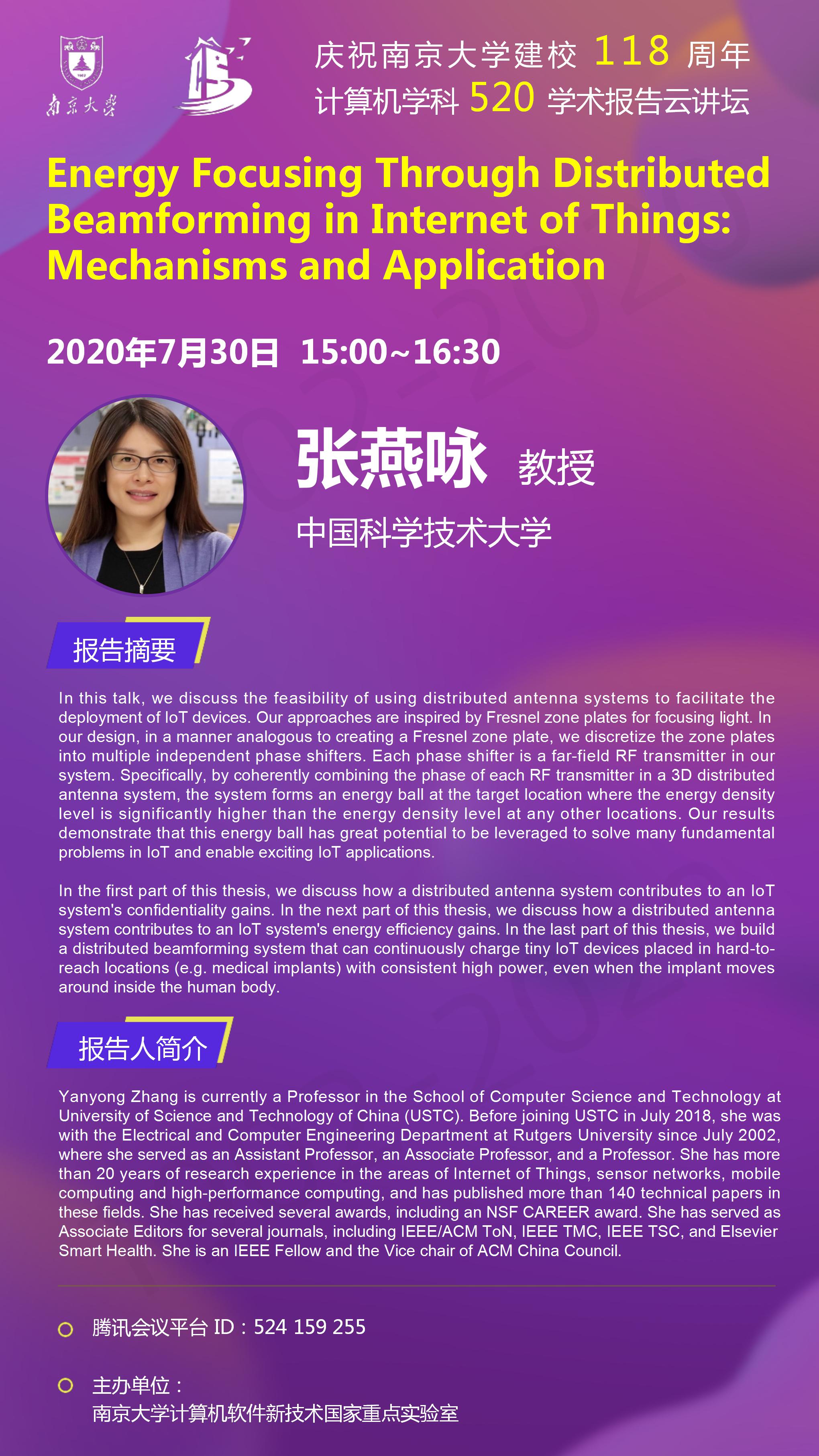 庆祝WILLIAMHILL在线体育投注建校118周年 计算机学科520学术报告云讲坛- 张燕咏 教授