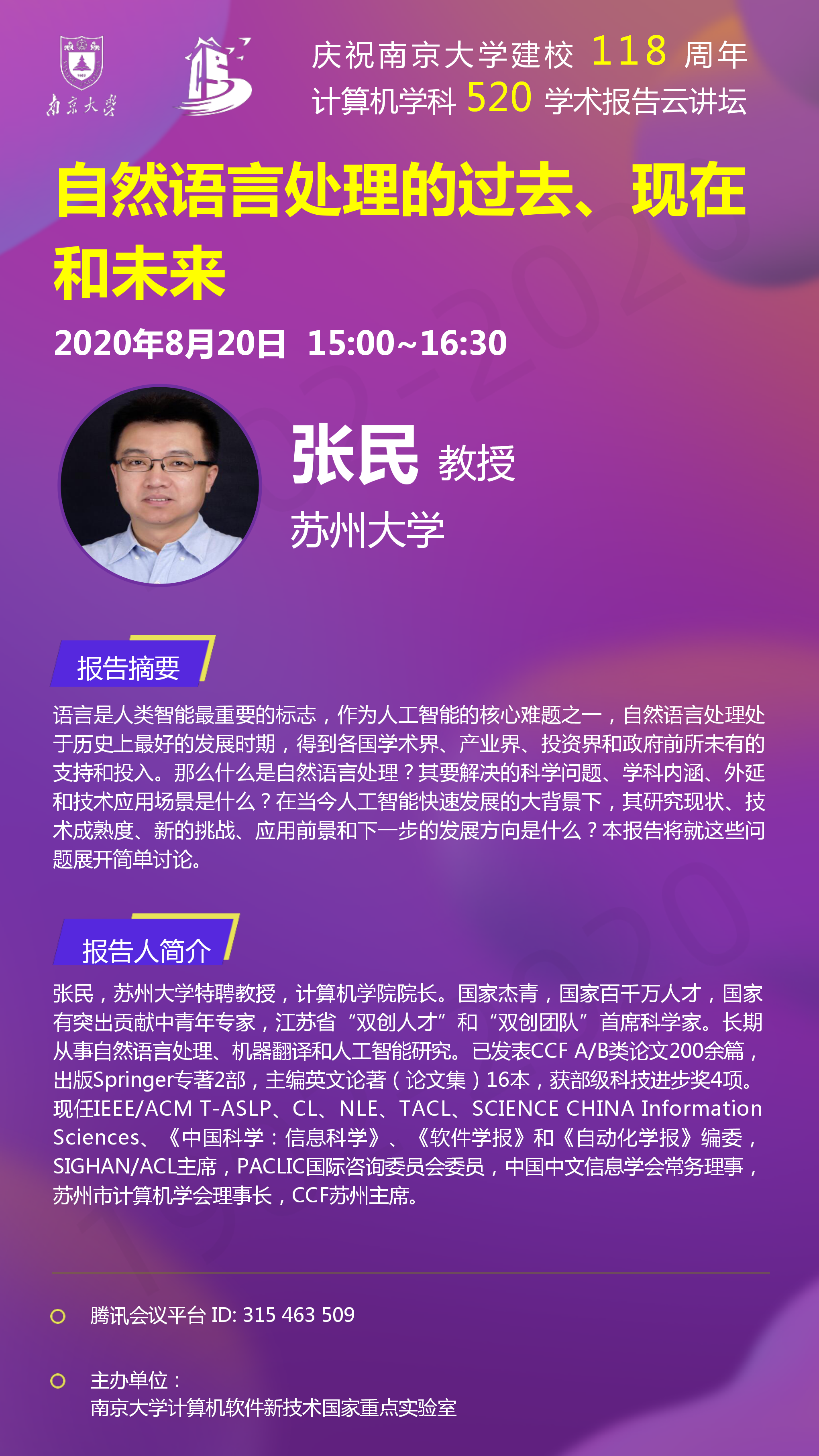 庆祝WILLIAMHILL在线体育投注建校118周年 计算机学科520学术报告云讲坛- 张民 教授
