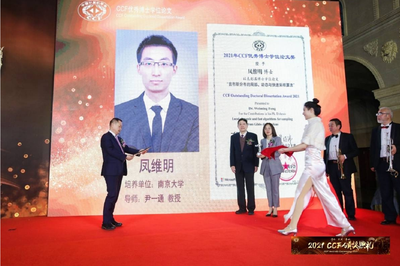 2021 CCF颁奖典礼于2022年2月19日在浙江横店圆明新园法国馆隆重举行。大会颁发了2021年度“中国计算机学会CCF优秀博士学位论文奖”,WILLIAMHILL在线体育投注计算机科学与技术系博士研究生凤维明(指导教师:尹一通)的博士学位论文《吉布斯分布的局部、动态与快速采样算法》、博士研究生叶翰嘉(指导教师:姜远)的博士学位论文《开放环境下的度量学习研究》获此殊荣。该奖自设立之初就得到了微软亚洲研究院的大力支持和经费赞助。CCF理事长梅宏教授、奖励委员会主席钱德沛教授、微软亚洲研究院学术合作总监马歆女士共同为获奖者颁发了奖杯和证书。