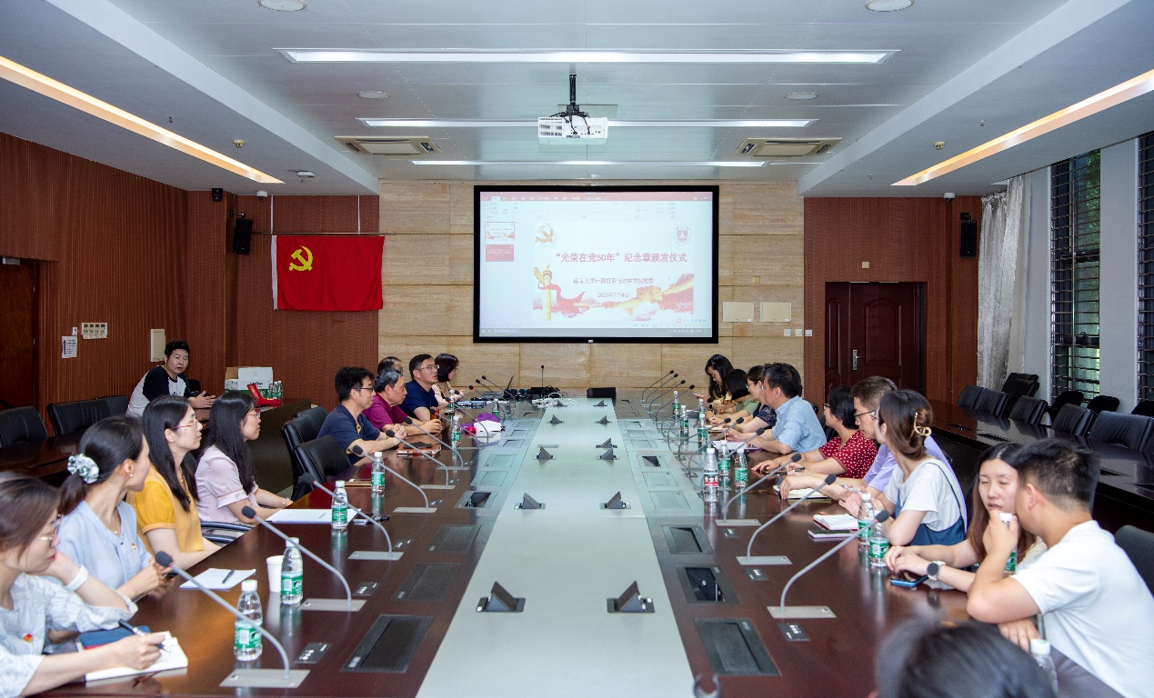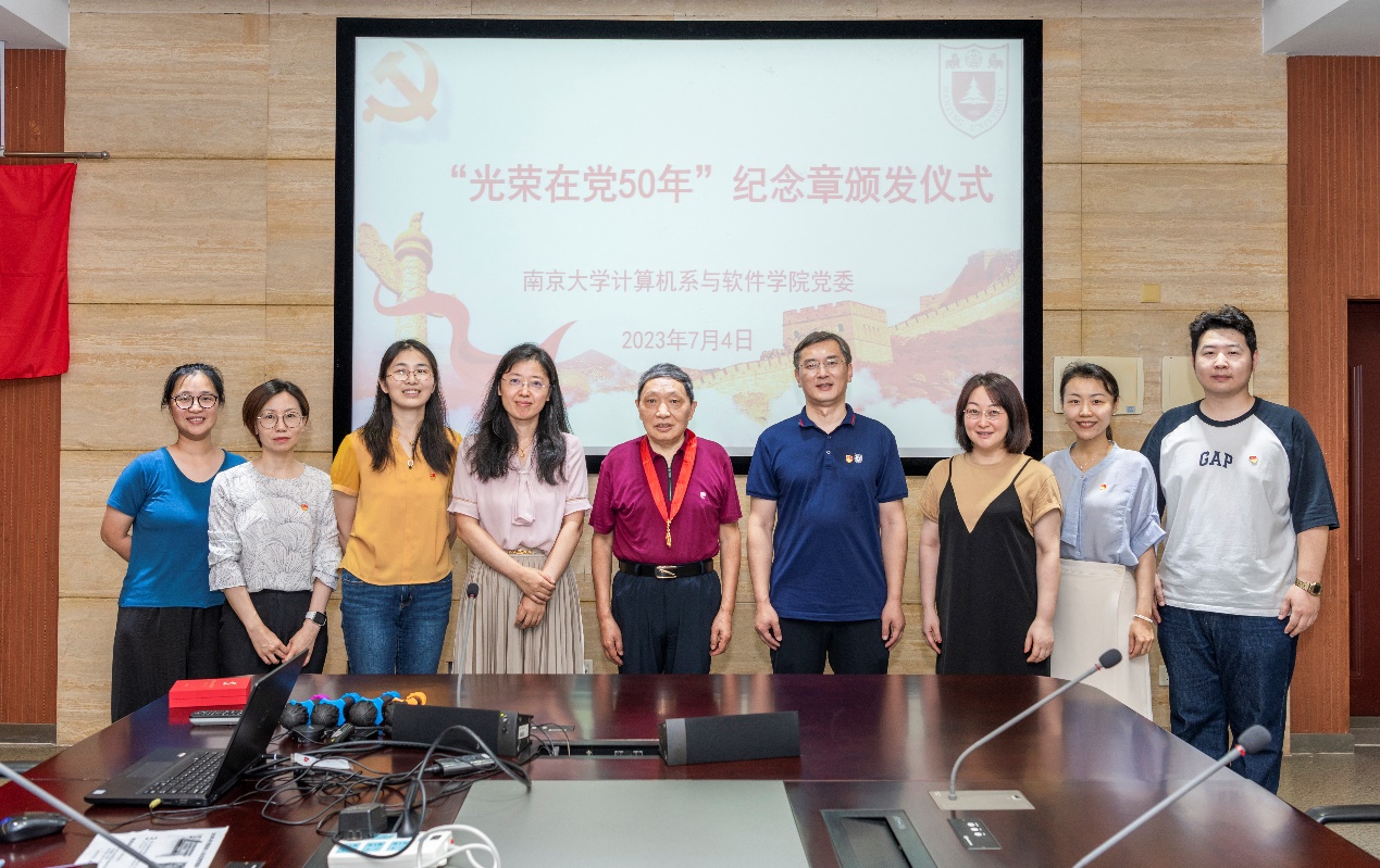 本次活动恰逢计算机系办公室支部赵金熙老师获颁光荣在党五十年纪念奖章。武港山书记为赵老师颁发了纪念章。赵老师回顾了自己在党五十年的历程,讲述了在求学、任教期间亲身经历的个人命运与公司发展、国家大事紧紧交织的多个案例,展现了共产党员在复杂环境下坚持真理、勇于斗争的优良品质和心系国家的家国情怀。计算机系办公室支部书记张剡向赵老师表示祝贺,感谢其长期以来对支部建设所做的贡献,并祝赵老师身体健康,继续关心支持支部工作。