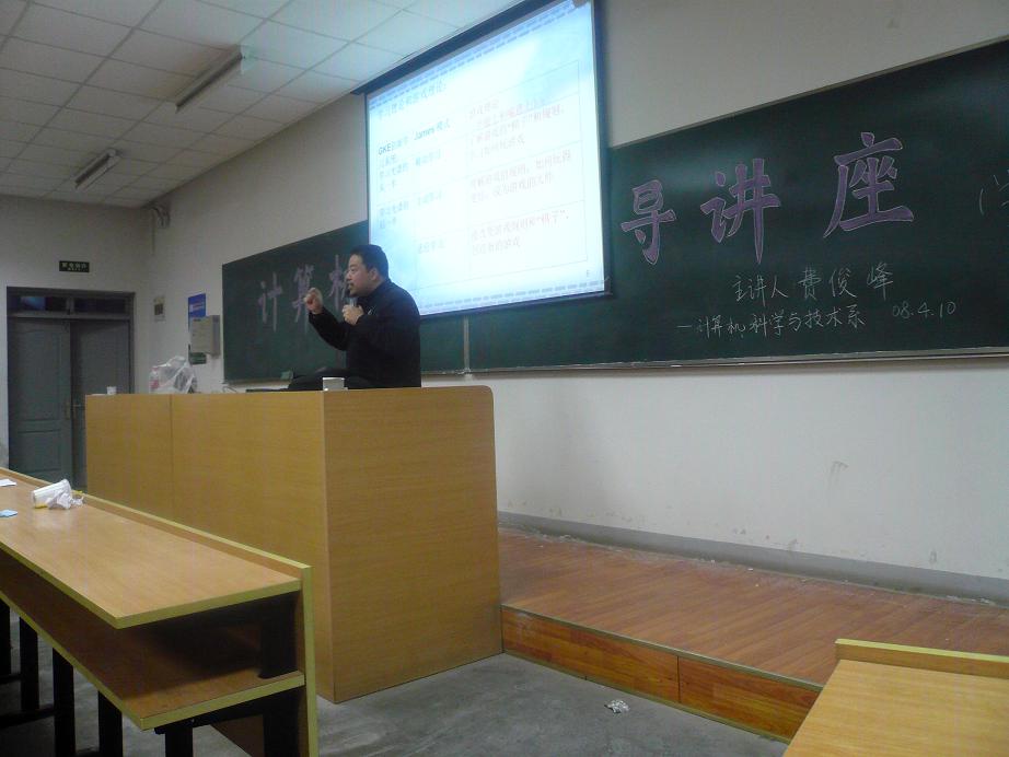 费老师在讲座中,结合计算机系本科生的专业特点,用“游戏”的比喻生动、形象地展示了大学本科四年的学习过程。通过向在座的同学们介绍“为什么大学这场游戏要通关”、“大学是什么”、“老员工的任务”、“怎样通关——练级”等问题,就同学们进校后面临的心态、学习、生活、社会交往等方面的变化及相关问题进行了逐一的解答和指导,帮助同学们明确目标,寻找实现自我的最佳方案。费俊峰老师的讲座深入浅出,内容丰富,为大一同学更好地适应老员工活提供了有益的指导,受到我系07级员工的热烈欢迎!