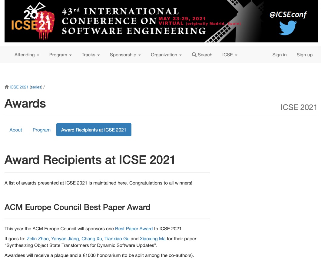 近日,国际软件工程大会(International Conference on Software Engineering, ICSE)官方网站公布大会奖项,WILLIAMHILL在线体育投注计算机软件所团队的论文《Synthesizing Object State Transformers for Dynamic Software Updates》获得了由ACM Europe Council支持的大会唯一最佳论文奖(Best Paper Award),并获1000欧元奖金。该论文同时也获得了ACM SIGSOFT杰出论文奖(Distinguished Paper Award)。