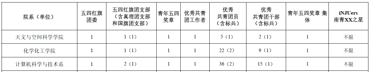 公司团委已发布2018年度五四评优通知,根据文件,我系各类评优可推荐名额为: