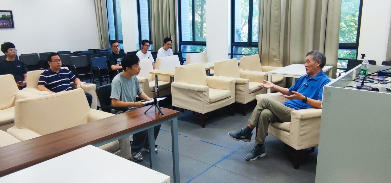 八月中旬,立秋虽过,暑气未消,天地间仍蒸腾着盛夏的余威。上午九时半,陈道蓄教授冒着酷署从住居的龙江小区专程乘坐一小时的地铁赶到仙林校区计算机楼219会议室接受釆访。访谈由公司2021级本科生刘博石主持,2023级本科生林雨昕协助拍摄,公司关工委副主任潘金贵教授以及在职青年教师过洁副教授和六名暑假在实验室加班的研究生全程参加了眝听学习。