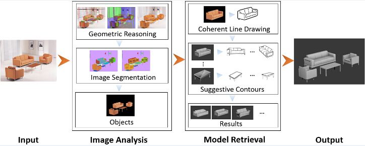 An overview of our approach. With an input indoor scene image, the output 3D scene is reconstructed with a two-stage process: image analysis and model retrieval.