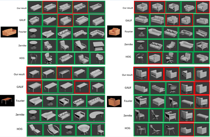 Retrieval results for one scene using different feature descriptors. Red frame indicates the model belongs to the Ground Truth while green frame indicates it beyond the Ground Truth. (Please refer to the supplementary material for clear image)